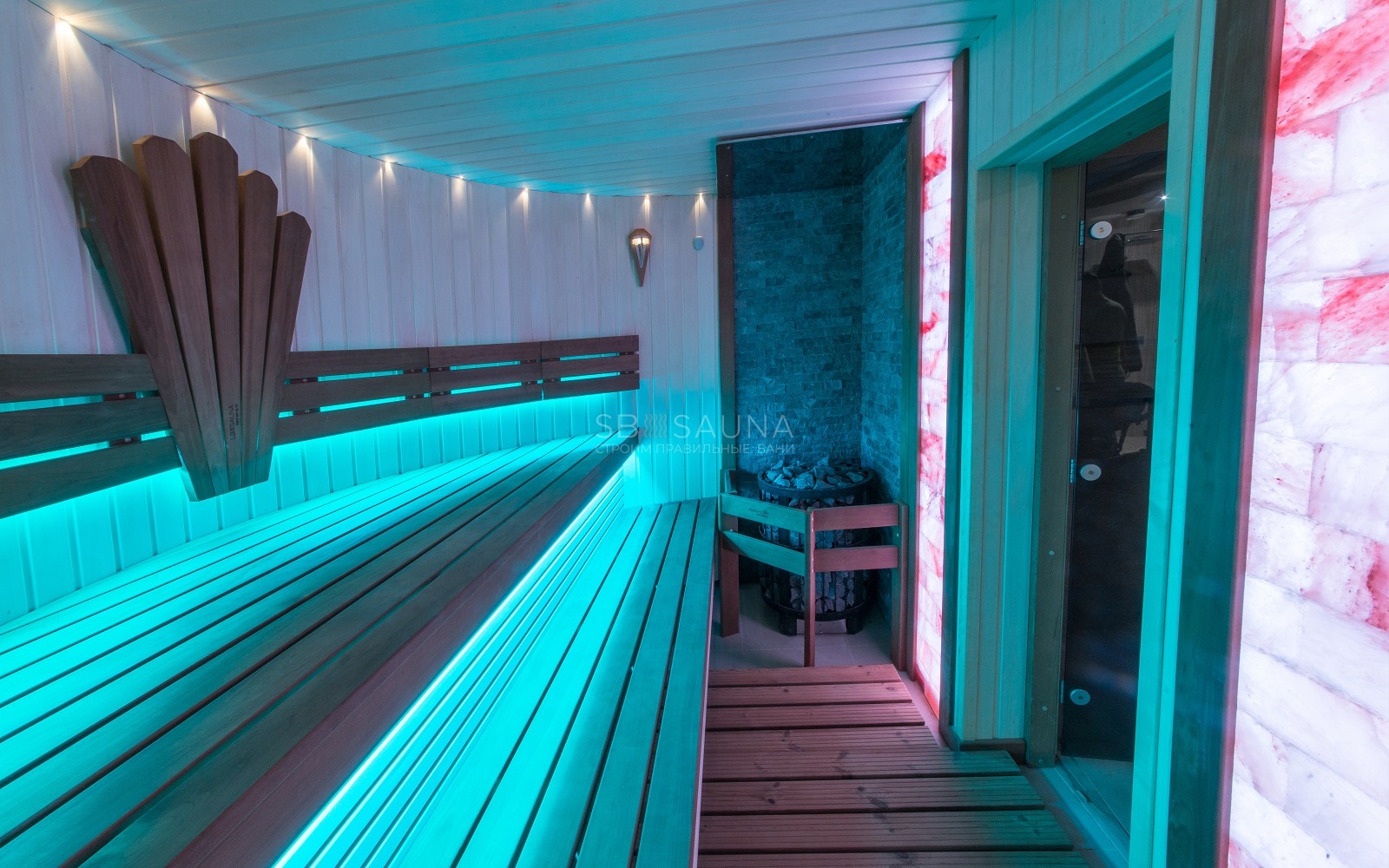 Для декора заказчик остановился на панно из гималайской соли, что стало ярким важным акцентом в дизайне данной сауны.