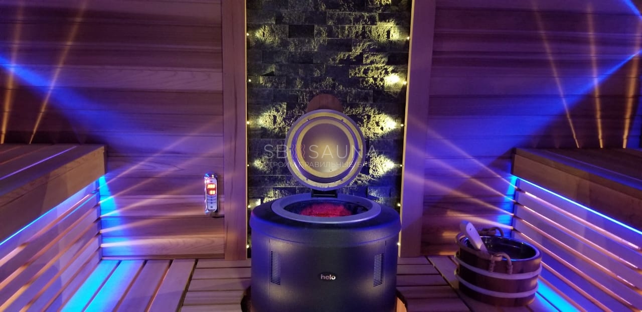 И, конечно, сердце парной - финская печь Helo (термос). Дизайнерская каменка для изысканных саун разработана известным финским дизайнером Ristomatti Ratia. Каменка идеально подходит для угловой установки.