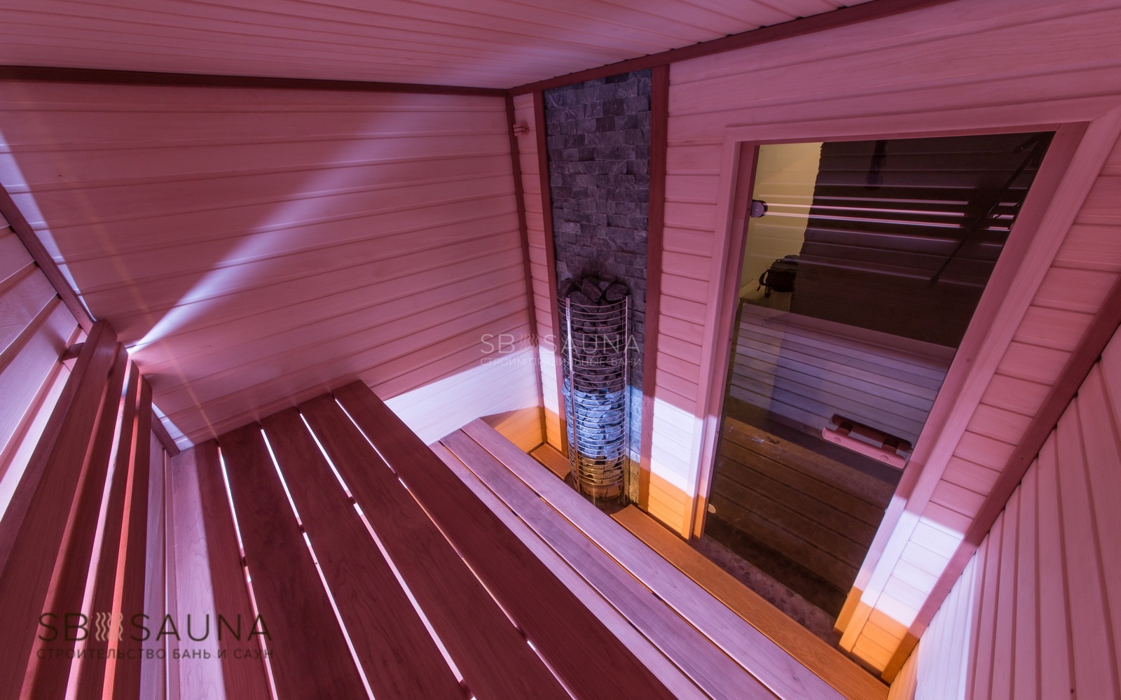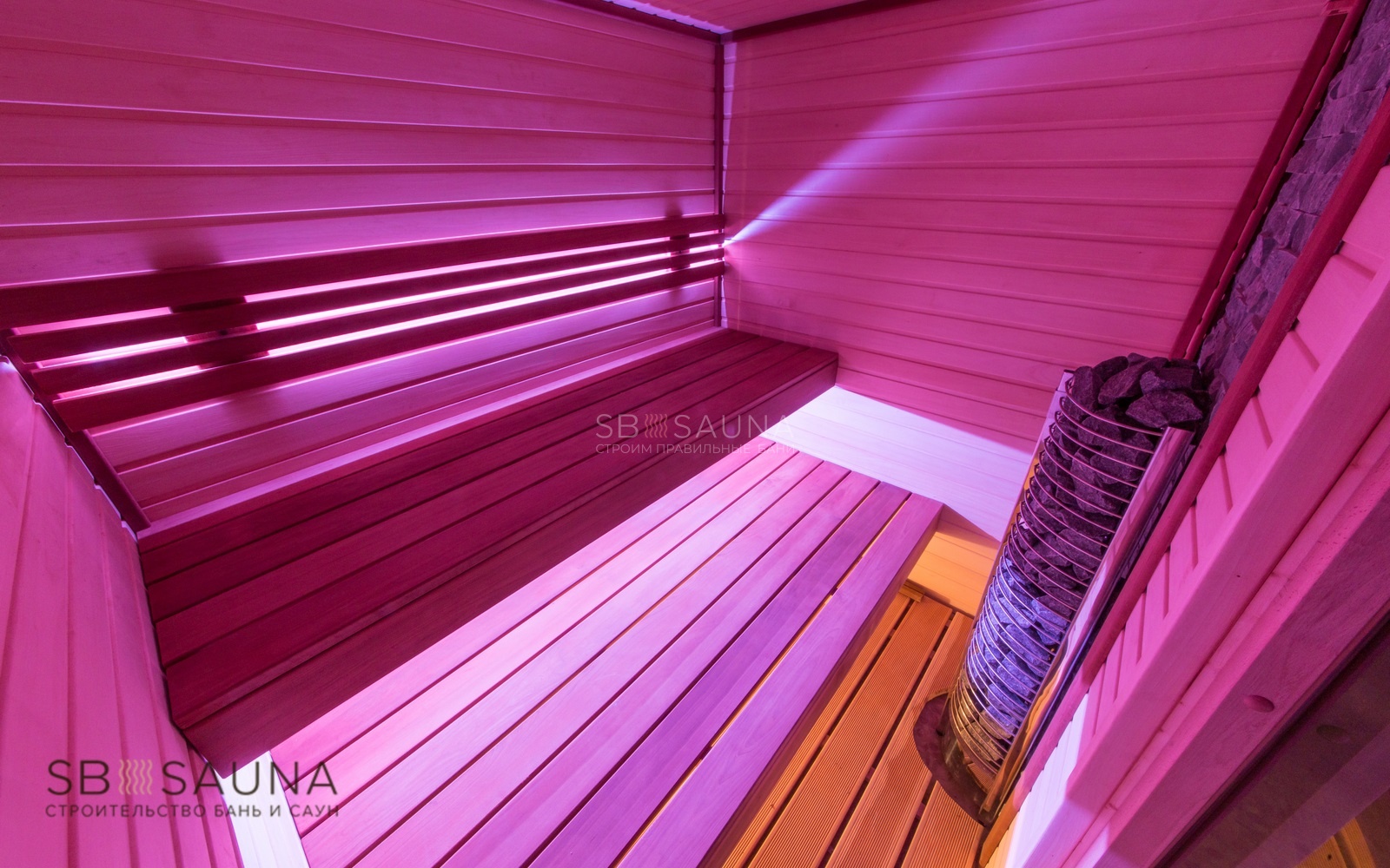 Многоярусные лавки позволяют регулировать температуру пара, которая Вам наиболее комфортна. Для создания более камерной обстановки для освещения мы применили светодиодную подсветку.